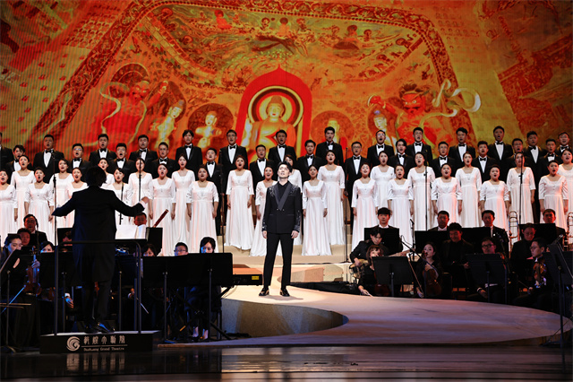 整台演出在著名琵琶演奏家赵聪演奏的《丝路飞天》中拉开帷幕,琵琶的弦音时而在空灵中流转,时而雄浑激昂,与敦煌图案背景相得益彰,带领观众“穿越”回了一千年前的莫高窟。舞蹈《飞天彩虹》以敦煌壁画中的飞天为造型,融入传统长绸舞技法,浪漫地展示了“美丽中国”,营造出敦煌壁画上的绚丽盛景。随后,《从前,有个地方叫敦煌》《凤侣鸾俦》《夜半逾城》《乘象入胎》等唱段依次上演,由中国东方演艺集团与兰州交响乐团、兰州音乐厅合唱团等优秀团队组成的两百多人的三管编制交响乐队、电声乐队与合唱团,以及多媒体呈现的敦煌壁画,向观众呈现出一幅幅全视听感受的敦煌文化图景。“赶路人”的字字铿锵与“守护人”的娓娓道来,为观众完美勾勒出《飞天》跨越时空、山鸣谷应的故事轮廓。“乾达婆”与“紧那罗”二人珠联璧合,共同在舞台之上呈现出熠熠生辉的现代“飞天”,“贵妇人”和“大善人”个性鲜明饱满,带来了极富戏剧性的表演。整场演出用音乐和舞蹈对话时空,触碰历史的余温,致敬璀璨文化的创造者、致敬不远万里的赶路人、致敬忘却自我的守护人,既是对千年莫高历史沉浮的回眸,也是对坚守大漠、甘于奉献、勇于担当、开拓进取的新时代莫高精神的传承和弘扬。《飞天》音乐会拉近了受众与中华民族共有精神家园的距离,是一次对中国传统文化精髓、中华文明内核的致敬与传承。