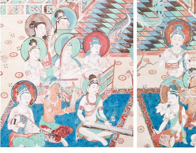 “茫茫大漠谣,悠悠敦煌曲。”这座位于河西走廊西端的世界艺术博物馆,同样有着绮丽绚烂的敦煌遗音,给我们呈现了一个极为壮观的音乐世界。敦煌壁画中保存了北周到元代的各种乐器,共计44种,4500余件。乐器品种、数量、表演形式以及时间跨度和延续性方面,都是世界上无与伦比的。