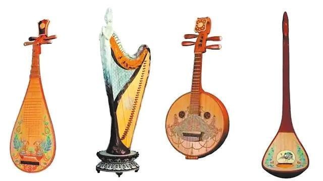 复原古乐器(从左至右为:琵琶、箜篌、阮、弯琴)