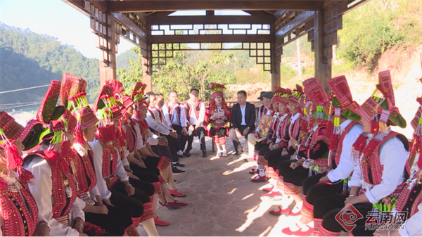 在哨冲镇拖竜黑村,水瓜冲社区党总支书记、居委会主任李绍春与当地彝族群众围坐在一起,围绕拖竜黑村近年来取得的成就,结合党的二十大精神,通过彝汉双语宣讲的方式,让习近平新时代中国特色社会主义思想在民族地区落地生根、开花结果。