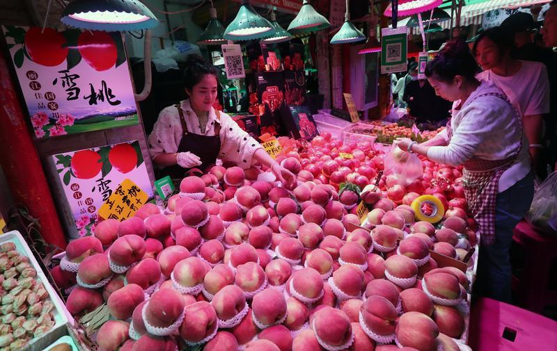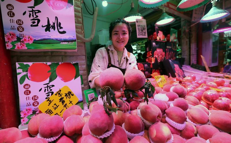 在大观篆新农贸市场,各类商品丰富充足,丽江雪桃大量上市。