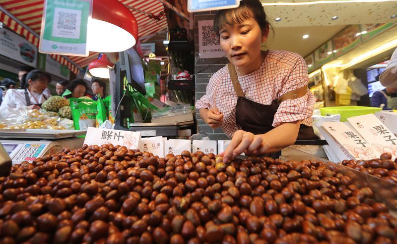 在大观篆新农贸市场,核桃、板栗等中秋节令果品供不应求。