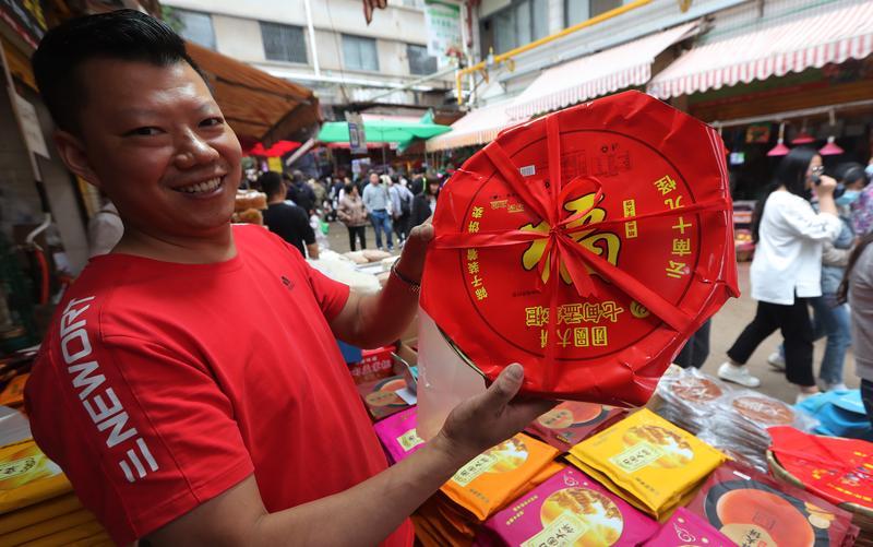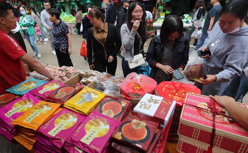 在大观篆新农贸市场,市民选购昆明七甸团圆大饼过中秋。