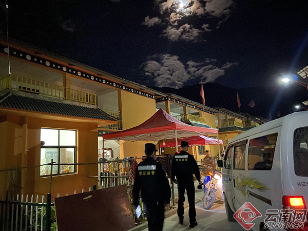 民警在观看中秋晚会后换上执勤装备,打开肩灯,驾驶巡逻车穿梭于片马镇街道至国门的主干道上,巡逻小分队走进街头巷尾执行治安巡逻工作,天上的月亮同车顶上的警灯随着执勤民警辅警的身影移动。
