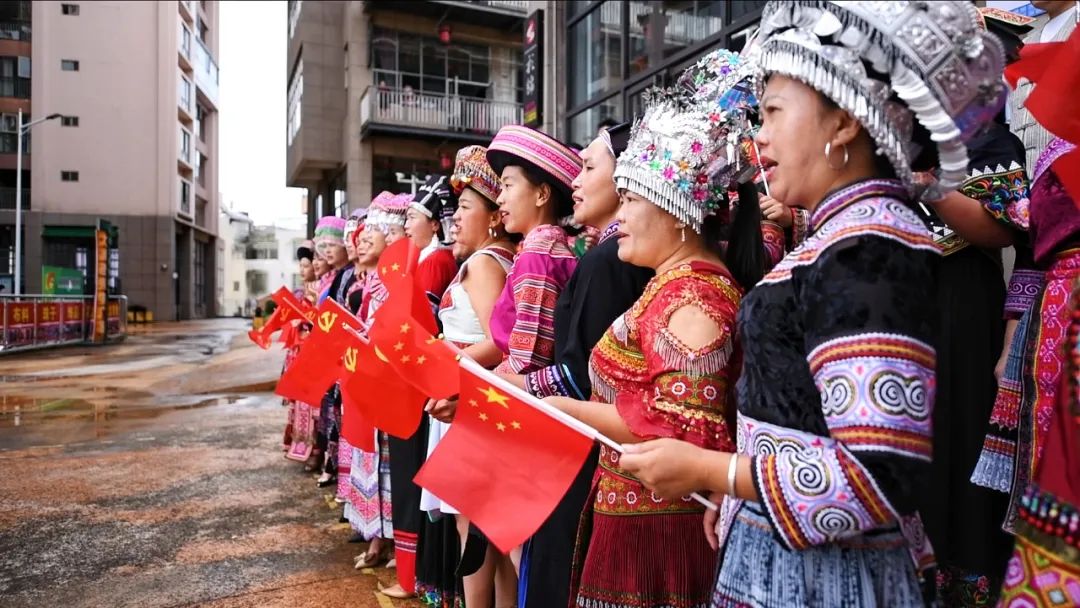 红河哈尼族彝族自治州金平苗族瑶族傣族自治县的苗族、彝族、壮族、瑶族、哈尼族、傣族、拉祜族、布朗族群众穿上盛装,共同祝愿祖国母亲生日快乐