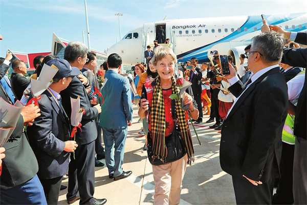 吴哥国际机场的停机坪上,参加首航仪式的嘉宾和队伍早已等候多时。伴随着欢快的音乐,飞机舱门缓缓打开,在充满柬埔寨风情舞蹈的烘托下,旅客们走下舷梯,挂上欢迎的水布,争相打卡留念。现场人头攒动,除了来自世界各地的旅客,还有项目建设者和来自中柬两国的投资方代表,大家欢聚一堂、共襄盛举,表达对新机场的祝福。