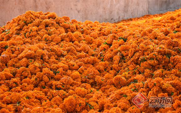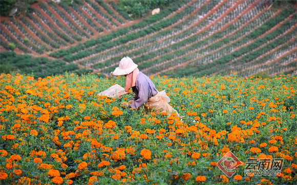 秋日,开远市灵泉街道的万寿菊相继绽放。一片片万寿菊如橙色宝石般镶嵌在山野间,村民们在花田里来回穿梭,动作娴熟地摘下花朵,一幅丰收美景图跃然眼前。