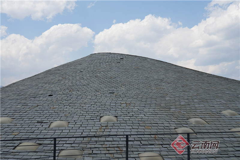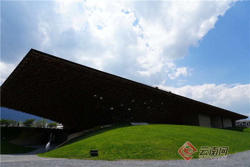 这,就是杨丽萍大剧院。这个被称为“大理最美艺术地标”的剧院面积达到8155平方米,位于大理古城南国城以东,外形错落起伏,造型的设计以“水印苍山”为灵感,起伏的屋顶和下沉的丘陵构成了户内户外两个剧场,塑造出虚实相涵、内外相生的自然景观,剧院的户外剧场部分如同一个用木棍搭建起的鸟巢,中间,光线顺着圆形的洞口倾泻而下,沿着起伏的小丘拾级而上走向屋顶,从阴影处来到阳光下,豁然开朗。屋顶上,丁达尔效应让热烈的阳光有了形状,苍山在垂射的光线中更加灵动神秘,古城就安静的躺在山脚,好像伸手就可以触到。