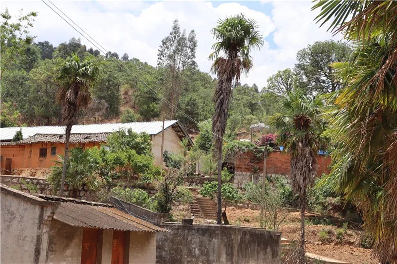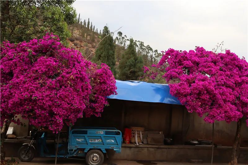 车沿着蜿蜒曲折的山路攀爬而上,人字形的路,一条通往四面房屋围在一起的“口”字形小院子;一条通往有着蓝色铁门的小平房,百香果的藤蔓攀爬在水泥墙上,抬头望去,率先看到的是园中一棵开得热烈的紫红色三角梅。
