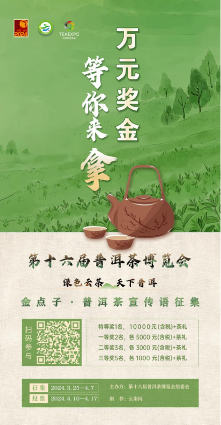 第十六届中国云南普洱茶国际博览交易会将于4月19日至22日举办,为期四天,设置国际标准展位1600个,有1200多家茶企参展。大会主题继续选择“绿色云茶·天下普洱”,展品涵盖普洱茶、红茶、绿茶及其他茶类,紫砂、陶瓷、茶包装、茶机械、新式茶饮等全产业链产品,并将围绕云南茶产业、茶科技、茶文化,策划开展品鉴会、研讨会、赛事、推介会等一系列精彩茶事活动,打造普洱茶博览会鲜明的IP形象,举办一场全国普洱茶展会盛典。