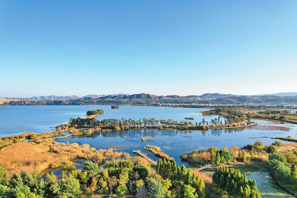 夏季的洱海,碧波荡漾,生态廊道上美景如画。