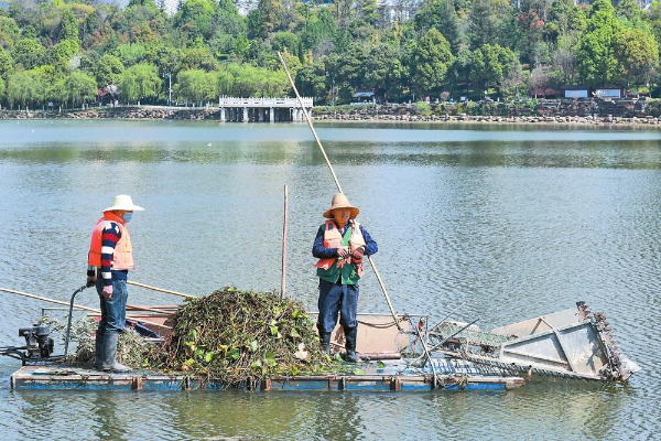 环卫工人在呈贡洛龙湖内清理垃圾。