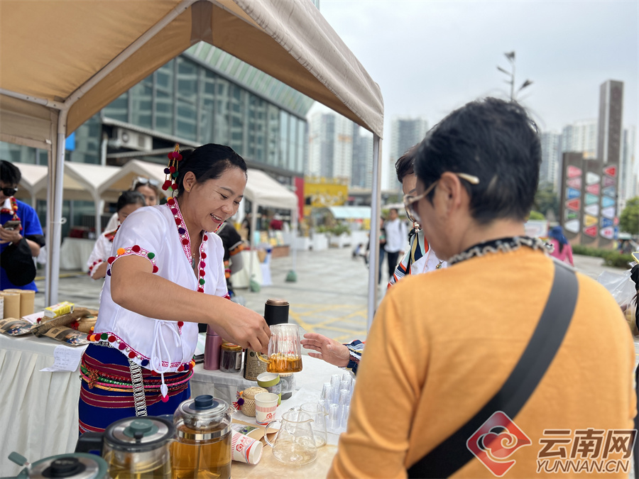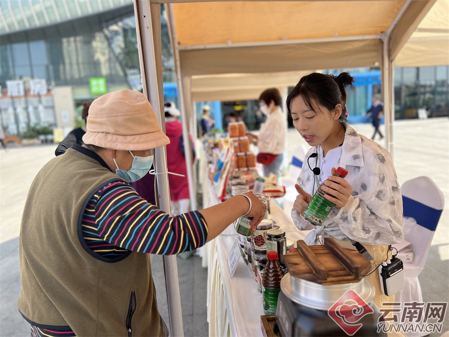 此外,现场还设置了20个乡村振兴展位,展出德昂族美食、非遗手工、农副产品等助农产品,以及其他少数民族同胞的特色产品。德昂泼水粑粑、傣味腌菜拌猪皮、胡辣子拌水果等少数民族特色美食吸引众多市民品尝购买。