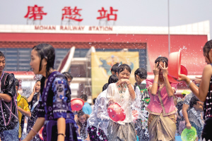 泼水狂欢活动将磨憨站站前广场变成了欢乐的海洋