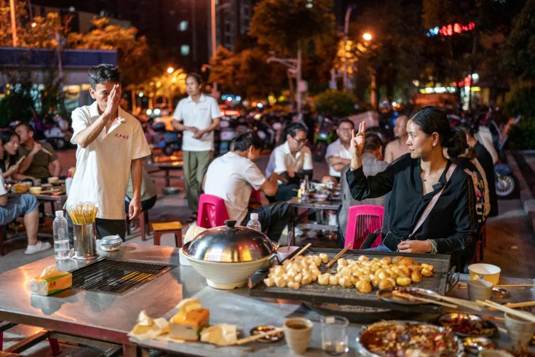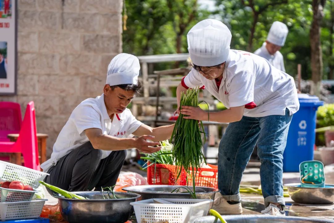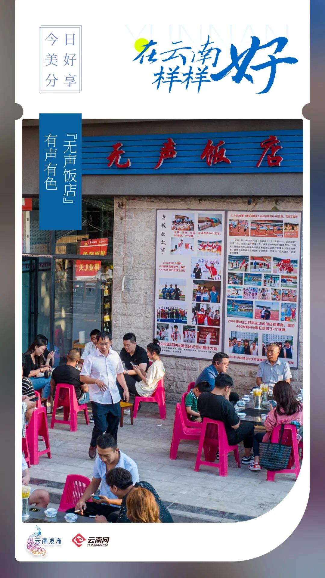 罗瑞(右二)给“无声饭店”的员工盛饭