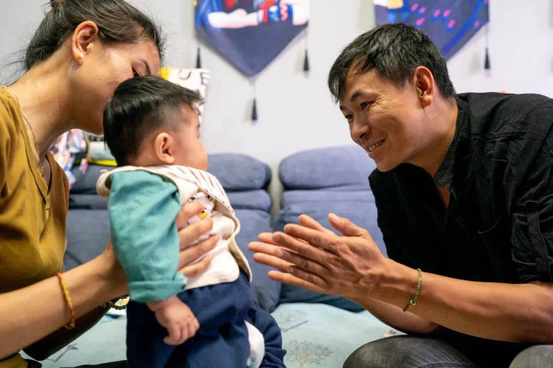 罗瑞(右)在家和刚满百日的儿子玩耍