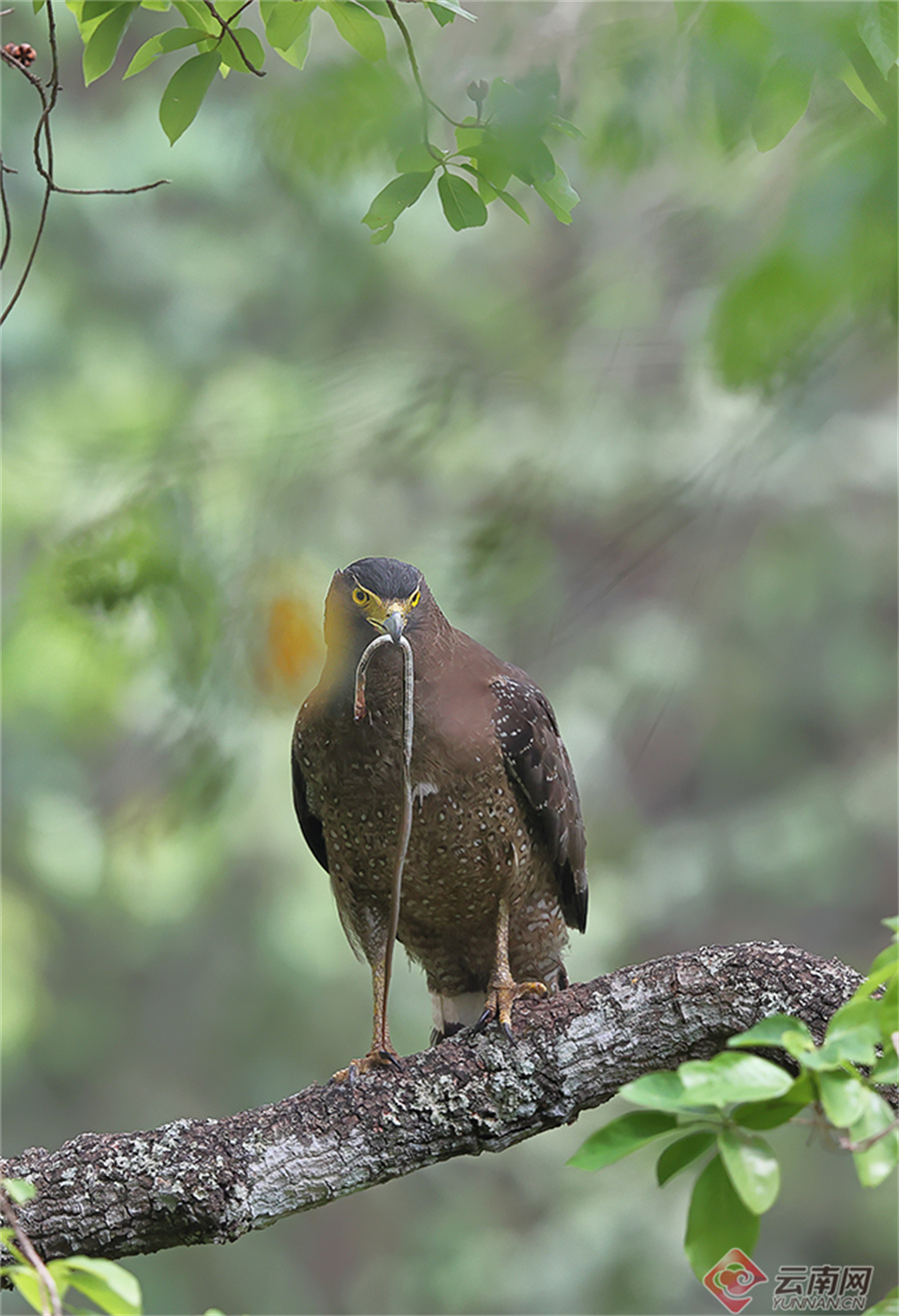 蹲守在树枝上的雄鸟发现目标后利箭样俯冲,百分之百的捕捉到蛇。