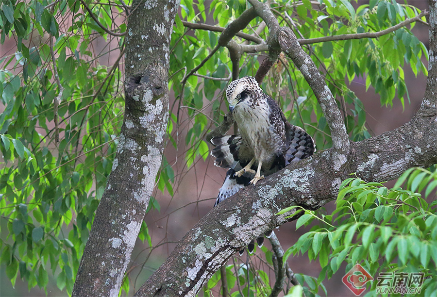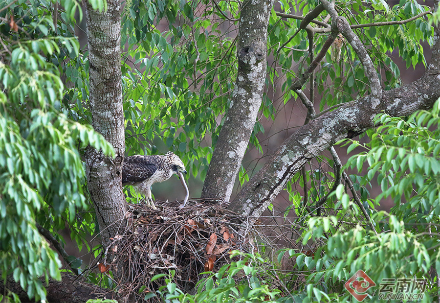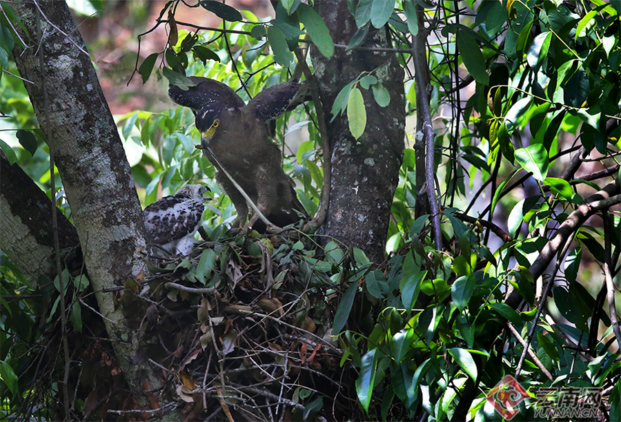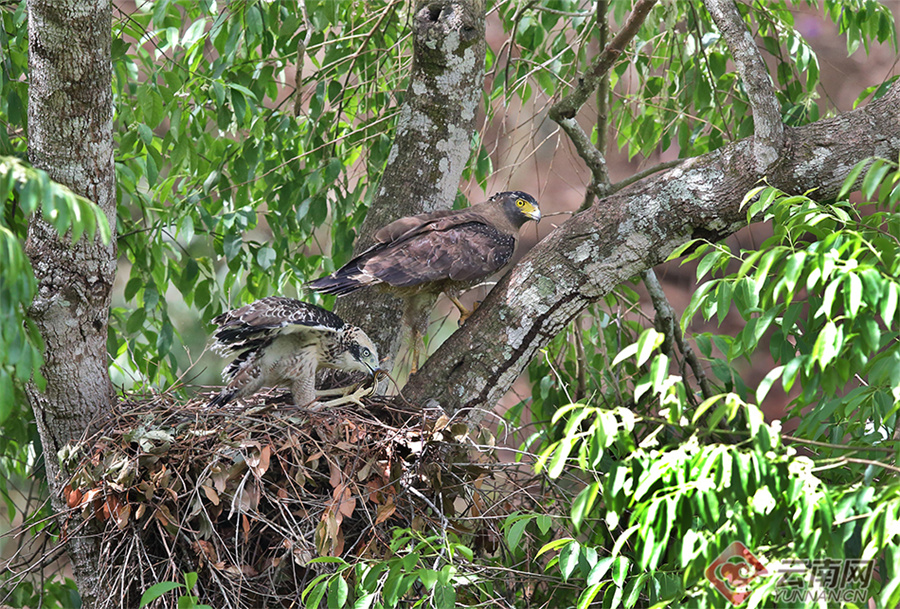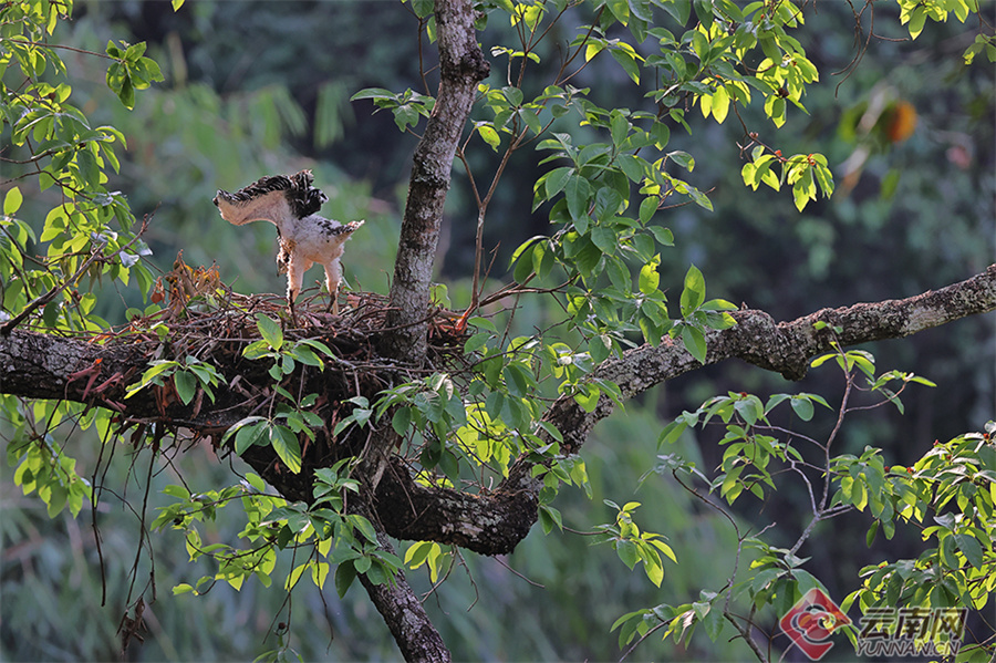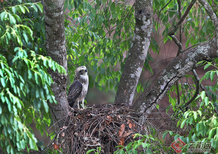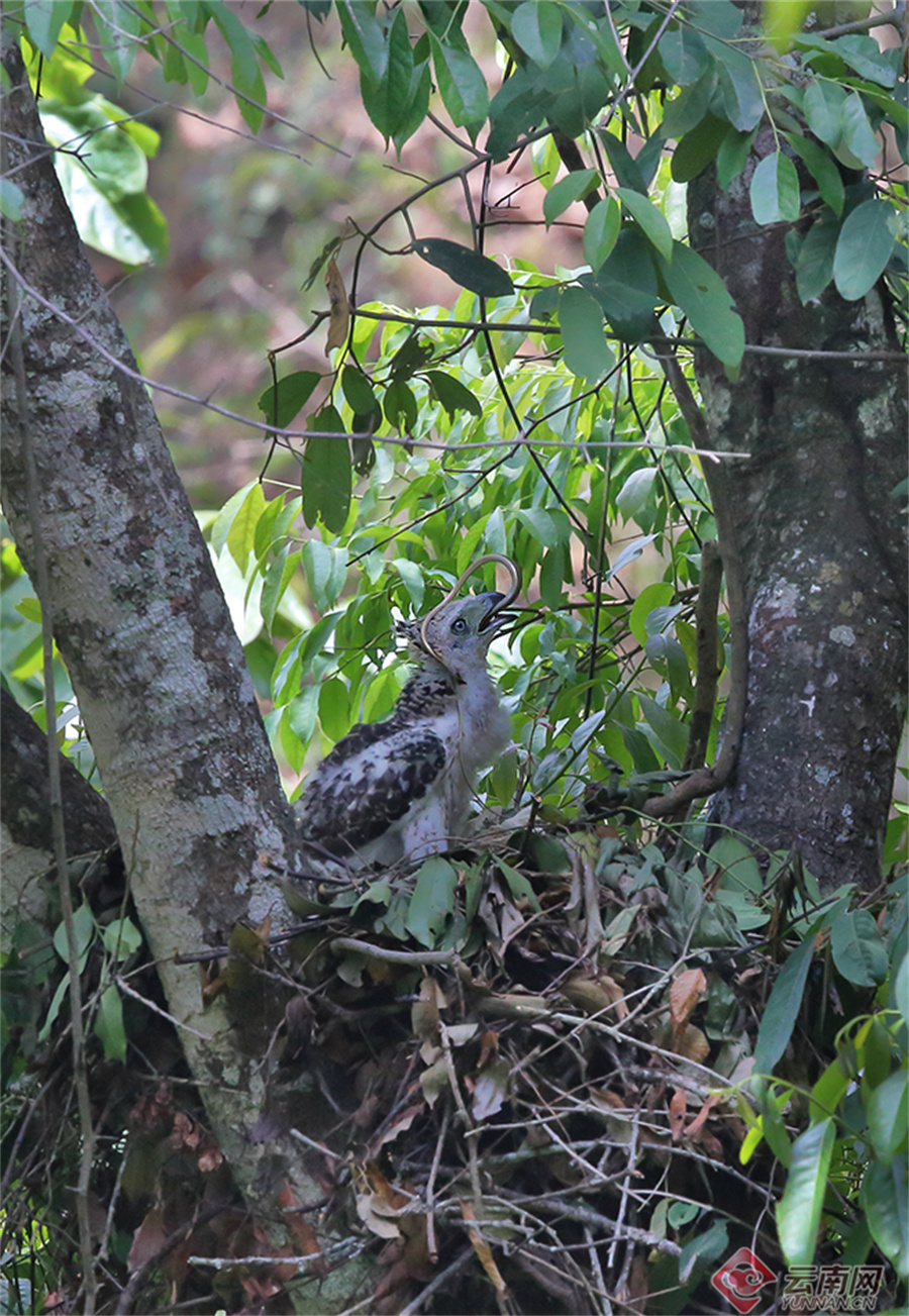 近日,在普洱市芒坝鹦鹉寨,蛇雕育雏成功,小蛇雕已经飞出巢穴。