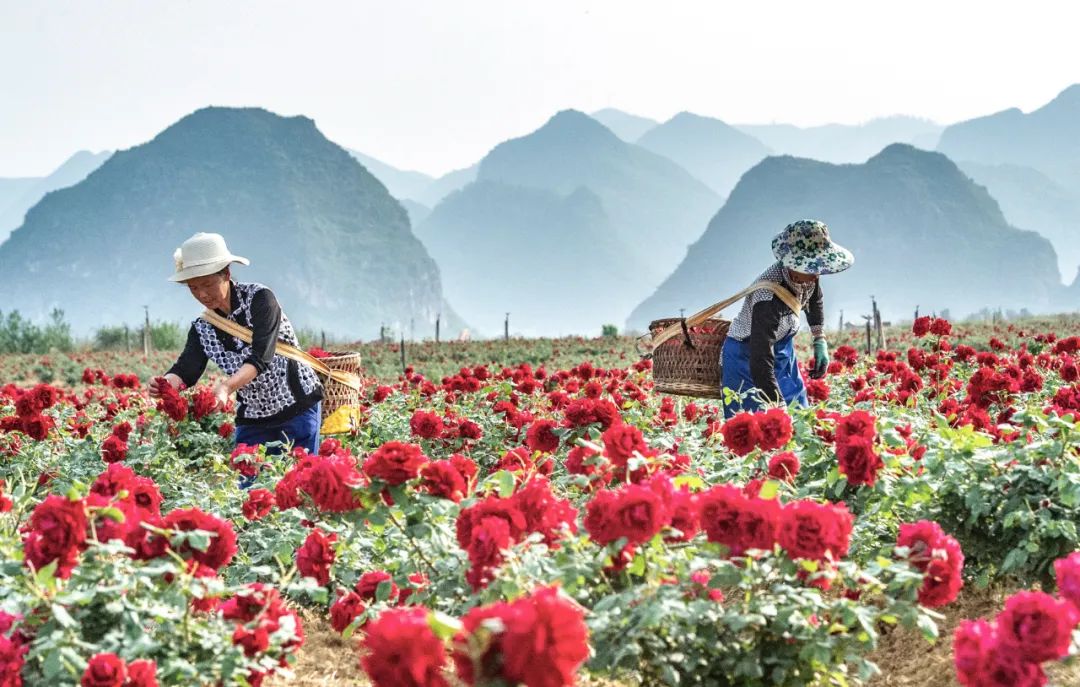 云南文山丘北普者黑玫瑰花种植基地,1000多亩高原墨红玫瑰花获丰收。新华社记者 熊平祥 摄
