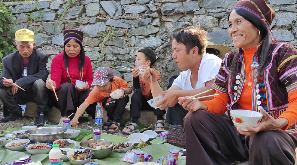 ▷欢聚一堂,围坐而食:哈尼族人以最质朴的方式,共享丰收的喜悦,传递邻里间的温情与互助。