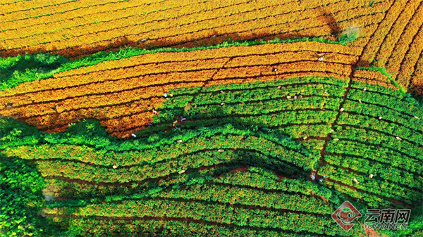 云南适宜的温度和充足的阳光,给具有喜光性的万寿菊提供了天然的温床,让其可以在这片土地上肆意生长。作为盛夏光景里的“黄金”作物,万寿菊受到了人们的热烈追捧。