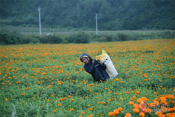 丽江市的农户背着刚采摘下来的万寿在花海里前行。 供图