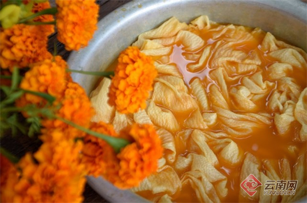 云南人吃花的花类品种中,万寿菊占有一席之地。在云南文山、红河、曲靖、丽江等地,万寿菊不仅仅是旅游打卡的观赏性花朵,还是美味菜肴的主要原料。味道鲜甜、清凉解暑的凉拌万寿菊,酥软可口、颜值爆表的菊花酥,营养滋补的万寿菊花鸡……视觉与味蕾的独特享受,让无数老饕纷纷慕名而来。