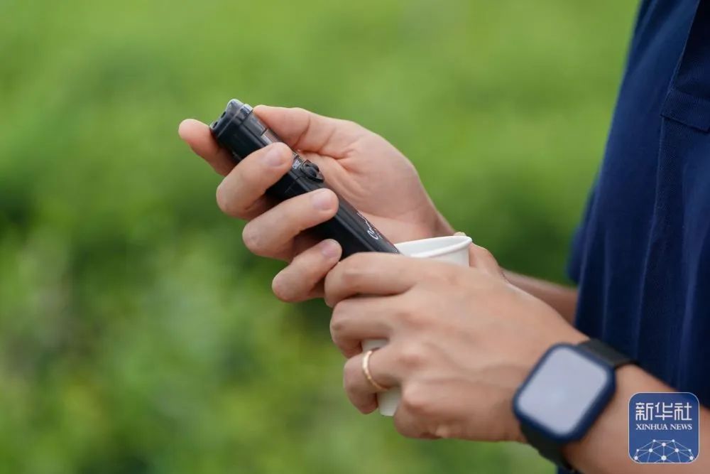 马赛使用测量仪检测大棚内蓝莓营养液的pH值 新华社 陈欣波 摄
