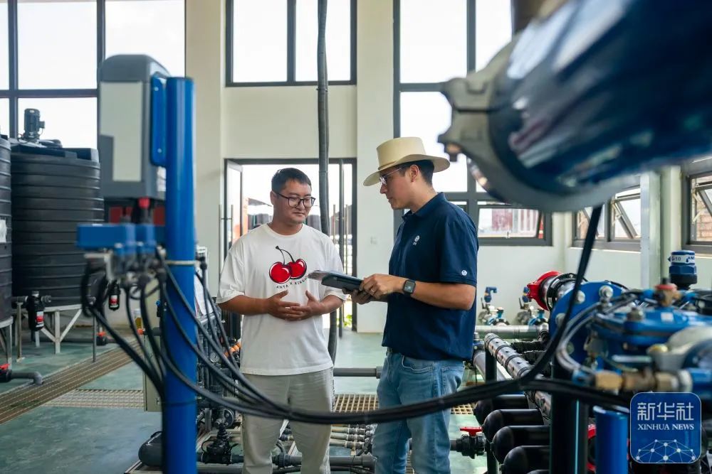 马赛(右)在蓝莓种植基地水肥一体化泵房内与基地主管宋君洪交流泵房运行情况 新华社 陈欣波 摄