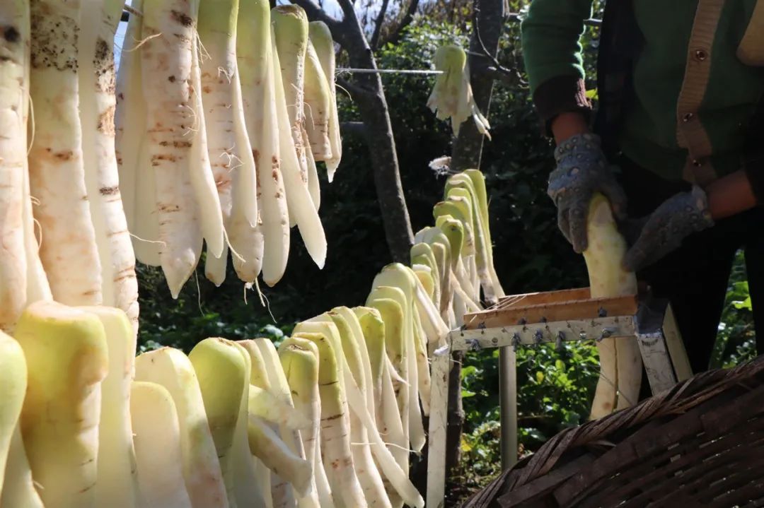 一排排雪白的干萝卜条正沐浴在阳光下