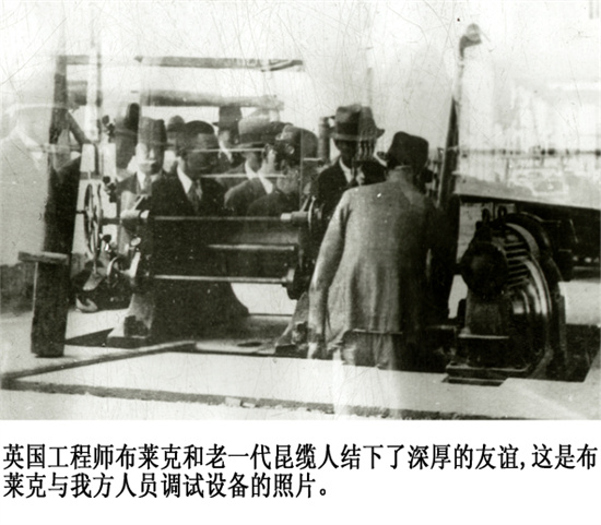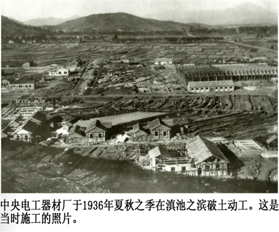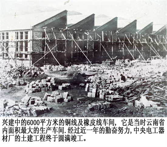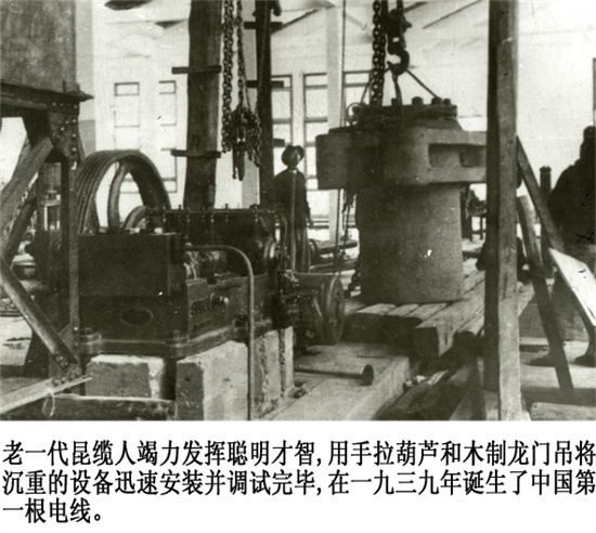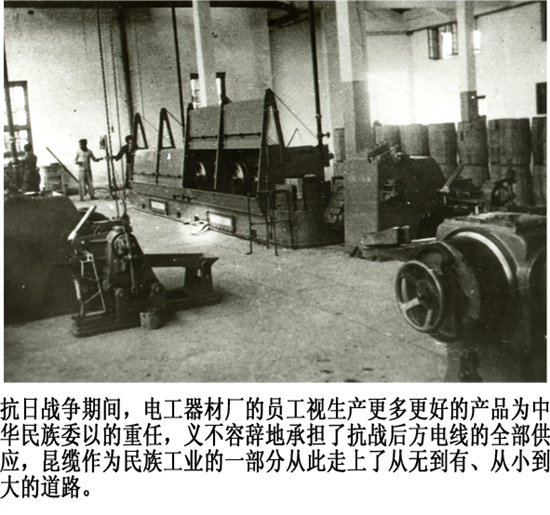 1939年7月1日中央电工器材厂第一厂正式建成,生产出第一根导线,从此洋电线独霸市场的日子结束了,昆缆人可以自豪地宣布:中国自己生产的第一根电线诞生了,而最初申请的“昆电工牌”的产品商标的也一直沿用至今。曾参加工厂筹建的英国工程师布莱克先生深为昆缆人的聪明才智和艰苦创业的精神所感动,拍摄下了许多动人的场面,多年后他回到昆缆,感慨成千,连同珍藏多年的中国自己制造的第一根导线送给企业,作为珍贵的文物存放于厂史展览室。