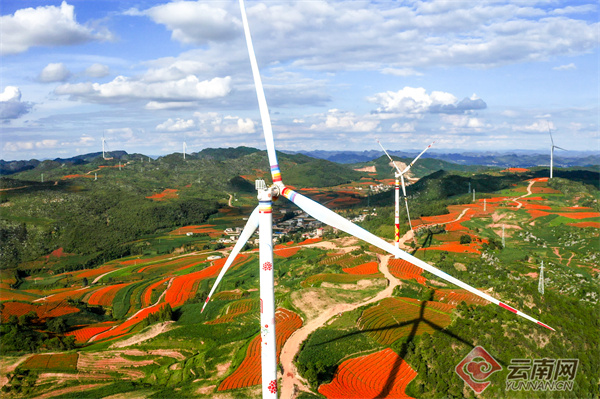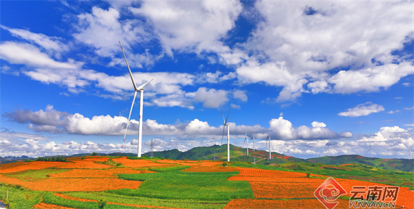 锦屏西风电场是国内规模最大高原山地百万千瓦风电基地的重要组成部分。秋日的万寿菊在山腰间铺展成金色花海,老农在田埂间耕耘劳作,远处沿山脊排布的风电机组叶片迎风转动,将风能转化为绿色电能持续汇入电网。