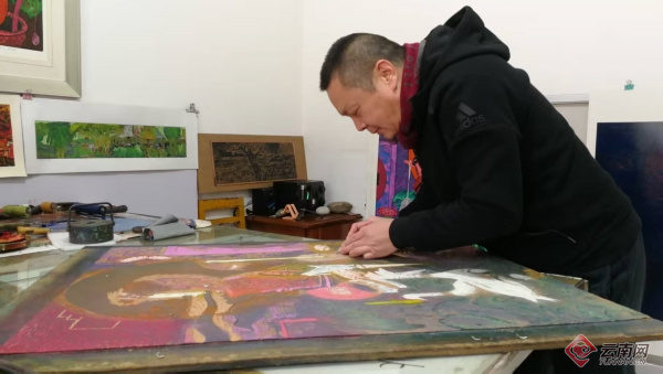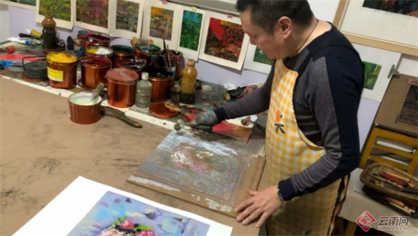 玉溪市研和街道秀溪社区一幢普通民房的三楼,阳光透过玻璃窗洒进房间,映照着一幅幅色彩浓郁、刀法精湛的版画,空气里弥漫着淡淡的油墨香和木屑气息,仿佛这个空间里飞舞的精灵。这里是云南版画家白绍斌的工作坊,一个诞生无数“绝版”艺术的地方。