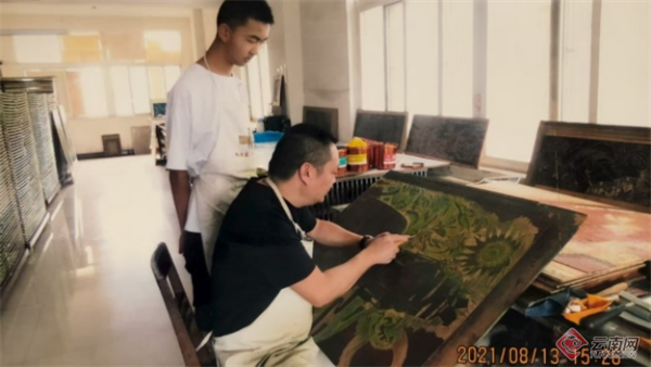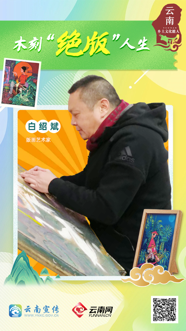 已经从事版画三十余年的白绍斌,是云南绝版木刻的代表人物之一,代表作《情缘版纳》系列、《戛洒花腰新娘》系列,展现了傣族的生活和文化,也体现着他对云南少数民族文化的深厚情感。他创造性地将版画雕刻技艺与云南重彩画的绘画技艺进行融合,使作品带有强烈的“木味”和“刀味”,在版画中的绝版木刻领域形成了鲜明的独特风格。