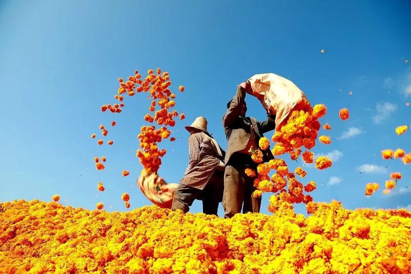 文山壮族苗族自治州丘北县八道哨彝族乡万寿菊喜迎丰收季。马卫忠 摄
