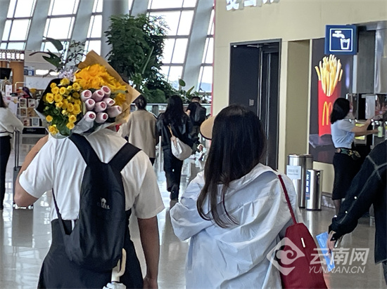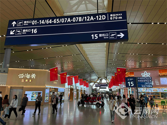 10月1日,昆明长水国际机场迎来客流高峰。机场内人头攒动,但秩序井然,鲜艳的国旗与旅客的笑脸交织成一派喜庆祥和的节日景象。