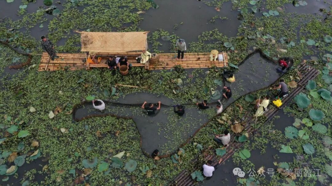 湖面赛场,哨声划破宁静。16支参赛竹筏如离弦之箭,队员们各司其职:有人挥竿击水,将鱼群驱向竹帘阵;有人默契配合,迅速收网合围。水花翻涌间,古老的渔猎技艺在当代重现生机。