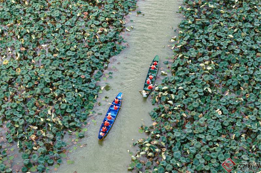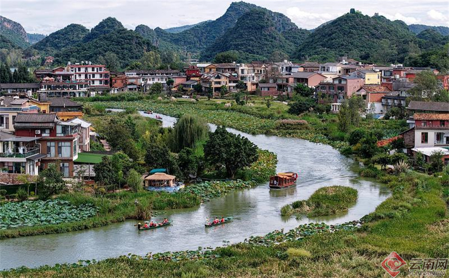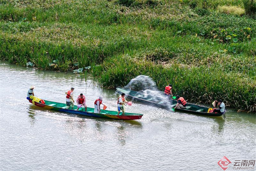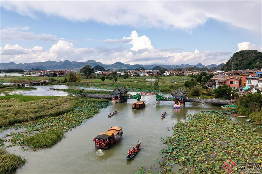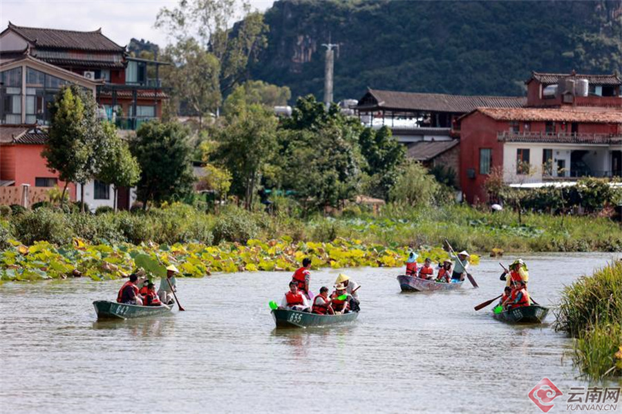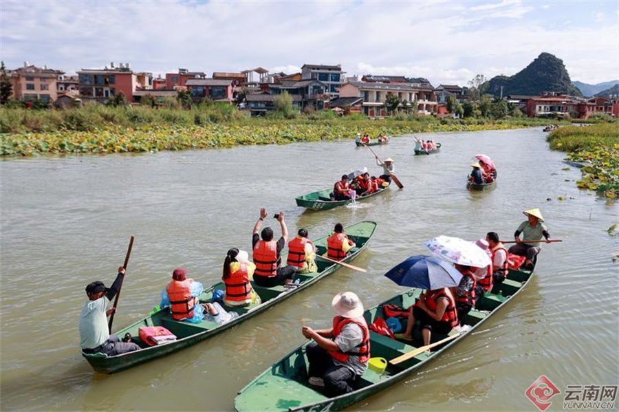 游客们泛舟湖上,游览普者黑村。胡妤雅 摄