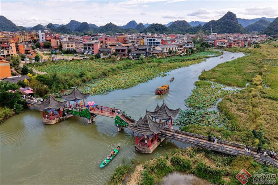 在普者黑景区,游客泛舟穿过情人桥。胡妤雅 摄