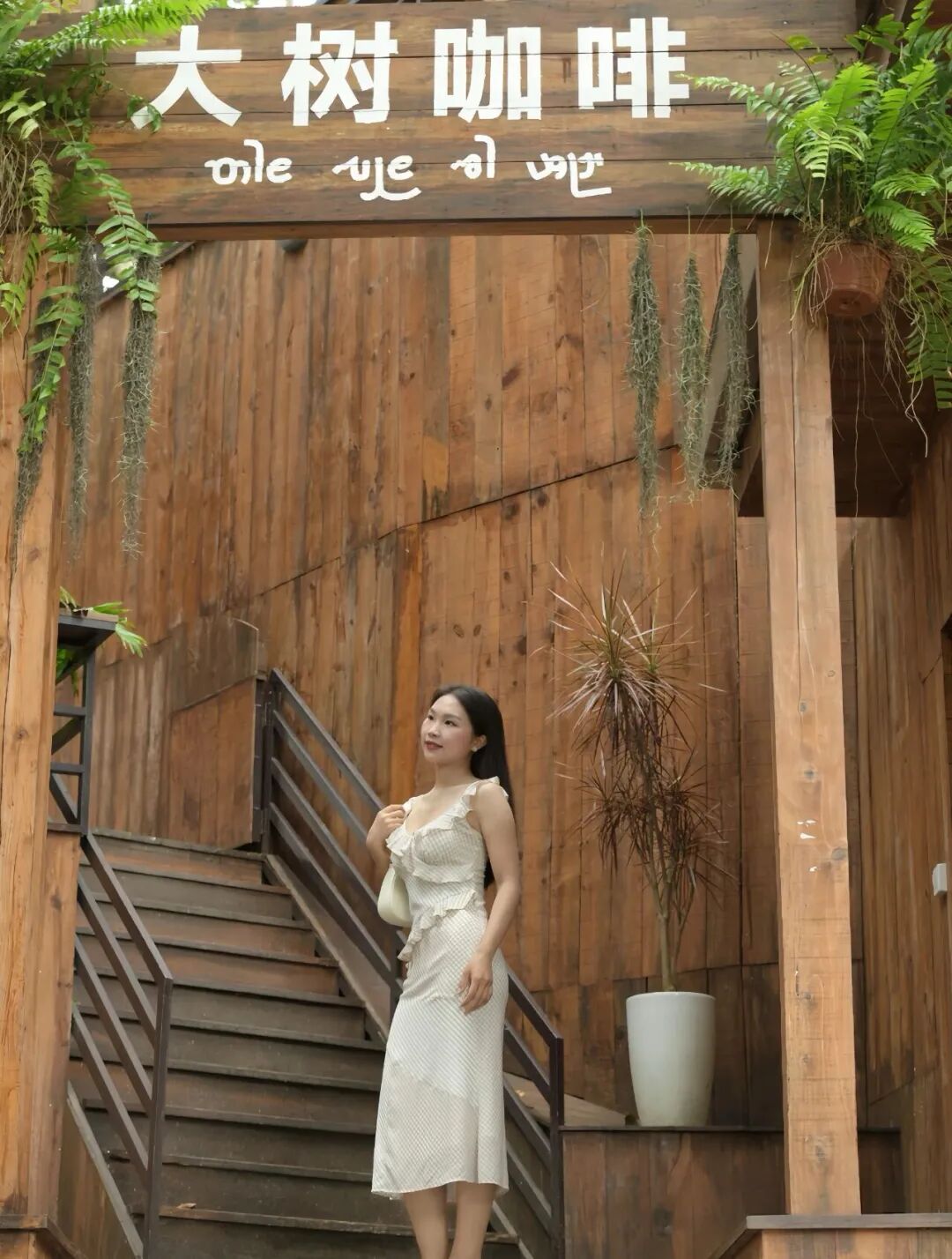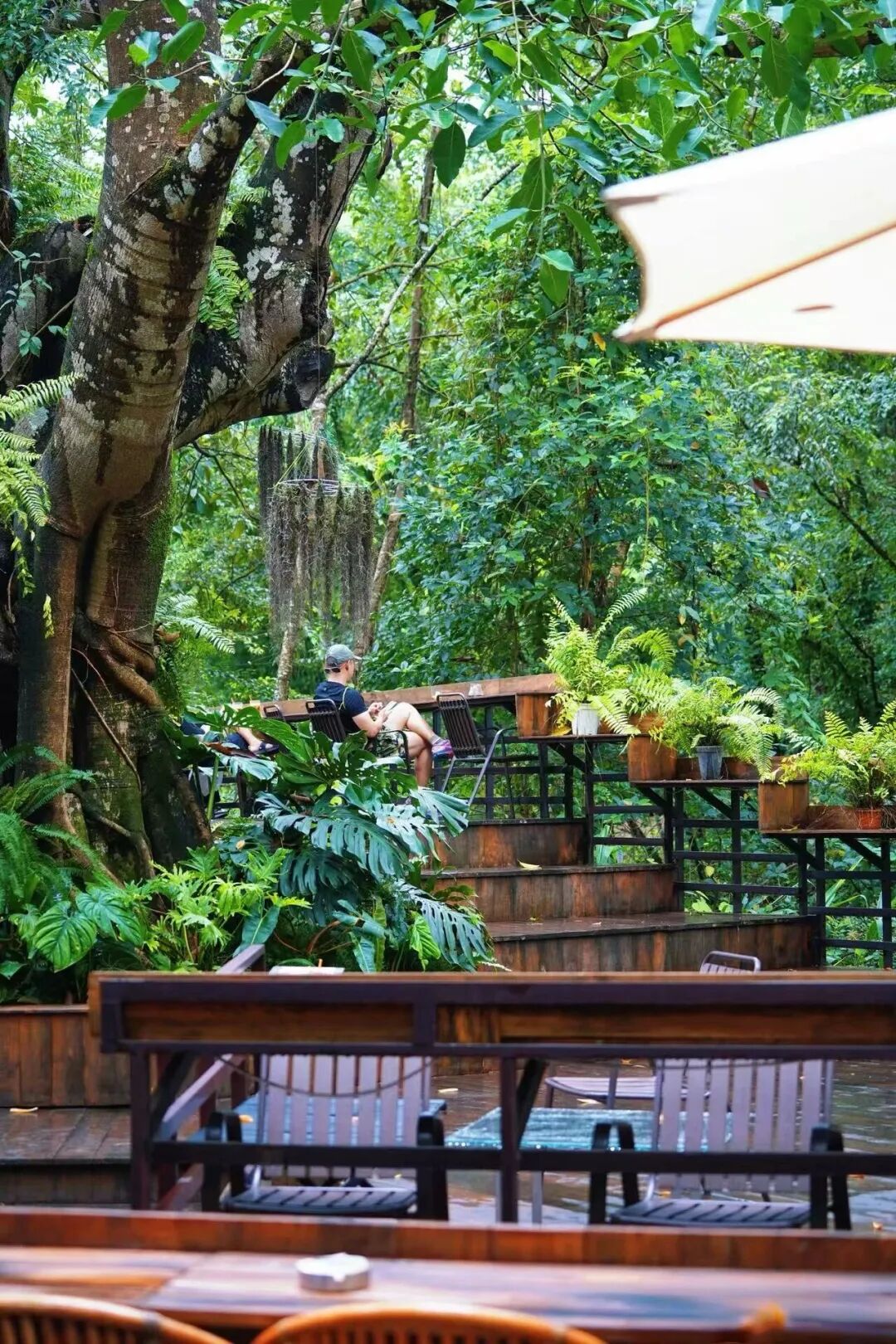 要论贴近自然的咖啡馆,藏在葱郁树林中的大树咖啡便是首选。大树咖啡位于德宏傣族景颇族自治州芒市,咖啡馆整体为木质结构,与周围的自然环境相得益彰,给人一种质朴、温暖的感觉。这里有一棵榕树,枝干粗壮,树冠巨大,气根垂落,形成天然的帘幕。