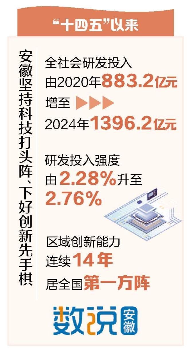 创新是安徽的金字招牌、金色名片。省科技厅相关负责人表示,“十四五”以来,安徽坚持科技打头阵、下好创新先手棋,以科技创新引领新质生产力,全力打造具有重要影响力的科技创新策源地。全社会研发投入由2020年883.2亿元增至2024年1396.2亿元,研发投入强度由2.28%升至2.76%,区域创新能力连续14年居全国第一方阵。