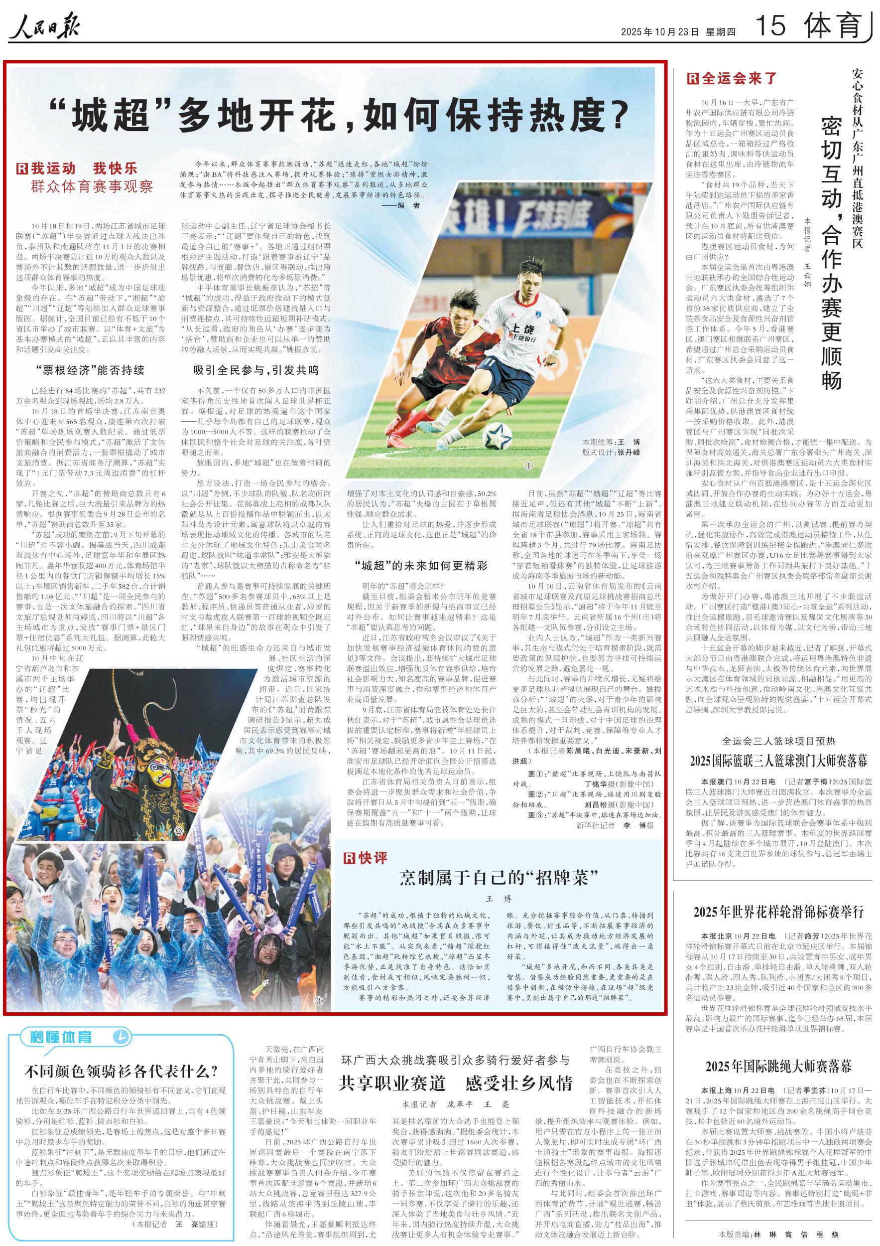 今年以来,群众体育赛事热潮涌动,“苏超”迅速走红,各地“城超”纷纷涌现;“浙BA”将科技感注入赛场,提升观赛体验;“豫排”重燃女排精神,激发参与热情……本版今起推出“群众体育赛事观察”系列报道,从多地群众体育赛事火热的实践出发,探寻推进全民健身、发展赛事经济的特色路径。