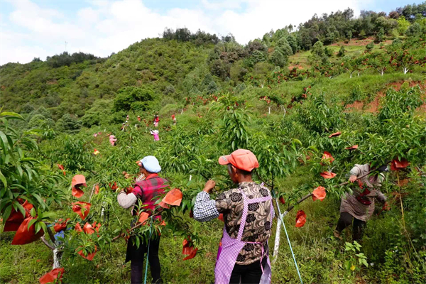 今年的9月,云南省曲靖市会泽县鲁纳乡狮子村的蜜桃基地里,饱满金黄的蜜桃压弯枝头,务工村民们穿梭林间采摘、在分装车间仔细包装,又一个收获季亮了。