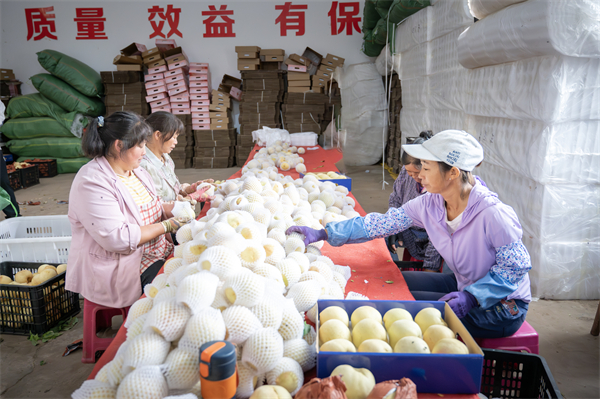 2025年9月,狮子村村民正在分拣“金秋蜜桃”。冯琰 摄