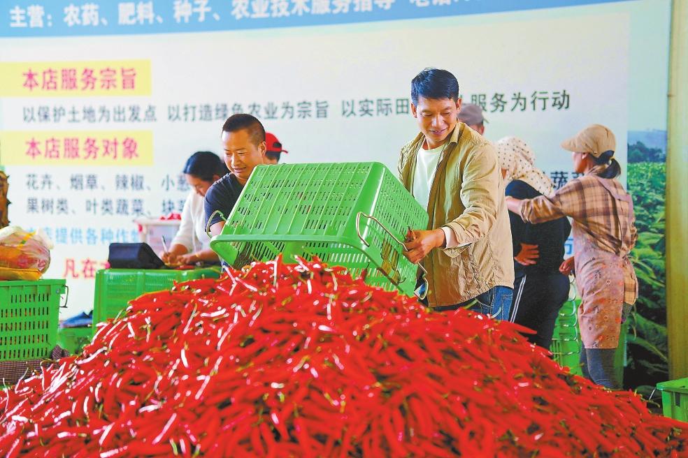 下午5点,农产品交易市场瞬间沸腾。三轮车、小货车从四面八方涌来,吆喝声、谈价声、欢笑声此起彼伏。“今年的辣椒品质特别好,我一天能收三四吨!”收购商普红坚一边过秤一边笑着说。