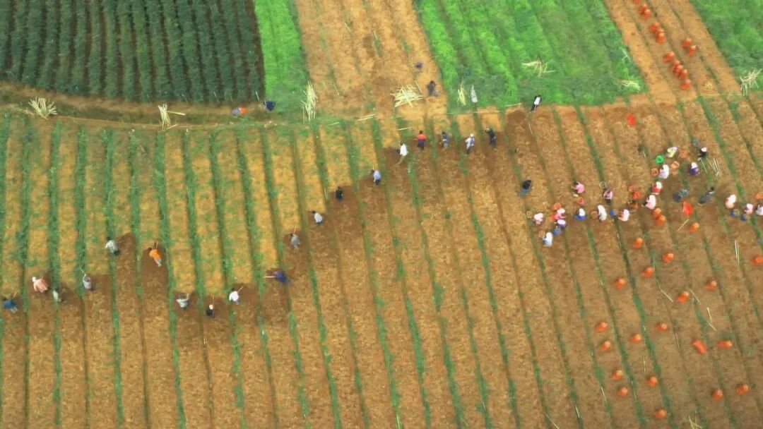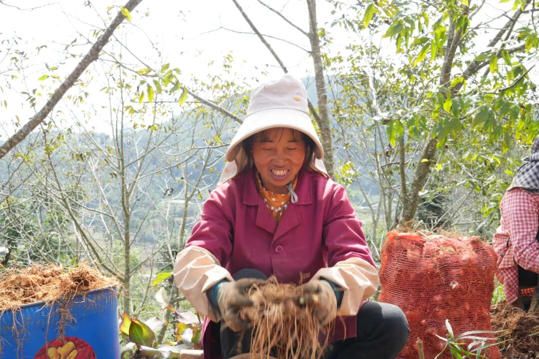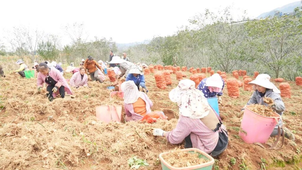 数百袋饱满的黄精在田埂上堆成“金垛”