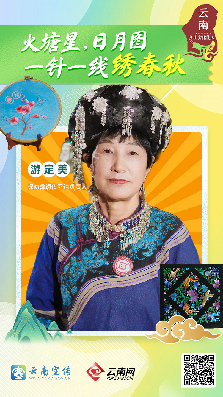 这些年,游定美足迹遍布德国、墨西哥、日本等8个国家,参与国内外文化交流活动50余次。她总是身着彝绣服饰,以针线为“外交家”,向世界讲述中国民族文化故事。在国内,游定美牵头成立禄劝彝绣协会,集合50余家彝绣企业,推动形成“禄劝彝绣”品牌。