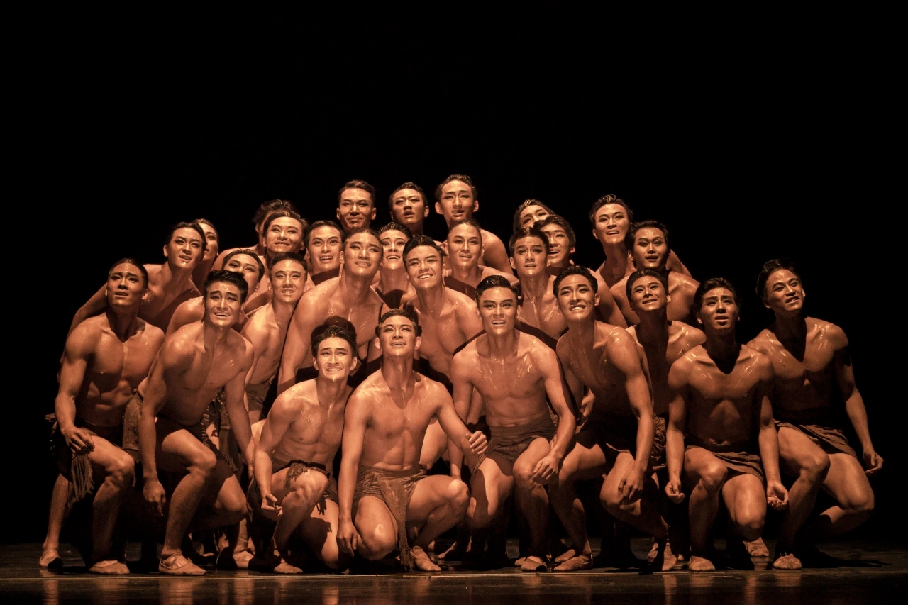 在这个充满力量和动感的作品里,有一个舞蹈段落显得格外静谧轻柔:舞者用身体构筑成一棵芭蕉树,芭蕉树旁出现了一朵漂亮的占芭花。领舞袁志平将它摘下,反哺大地,再重新捧起。