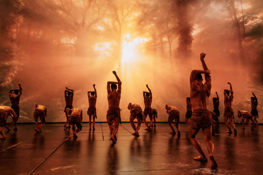 静态的象立住了,动态的迁徙如何表达?舞台上,一群男舞者呼喊着“水水水”,以激昂的节奏沿S形路线蜿蜒行进。“那不是走,是在迁徙,”袁志平说。动作源自傣族嘎光舞,舞步一起,舞台仿佛化为云南的雨林山川。这种充满原始力量和民族气质的集体舞动,是他们对象群“北上南归”事件的诗意回应。