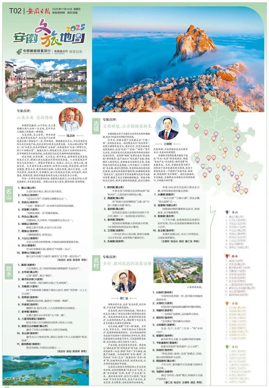 一张地图,包罗万象。“安徽文旅地图”涵盖名山、胜水、古镇、名村等37个垂类、300多个项目,山水人文之美一览无余,吃住行游购娱一“图”阅尽。权威专家、资深“驴友”发表专业见解,一句话精准点评项目精髓,凸显权威性、新颖性,让广大游客充分认知“安徽有多好”“安徽好在何处”。在中国邮政储蓄银行安徽省分行的大力支持下,“安徽文旅地图”呱呱坠地,化作一封满怀热忱的邀请函,盛邀五湖四海的游客,“按图索骥”游历大美安徽,用休闲的脚步丈量古今交汇的深度,在假期悠游里感知人文相亲的温度,在康养身心中体味这方水土向新而行的力度。